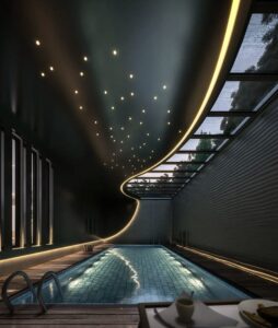 ويتم تصميم المسبح بطريقة عملية وجمالية في نفس الوقت.